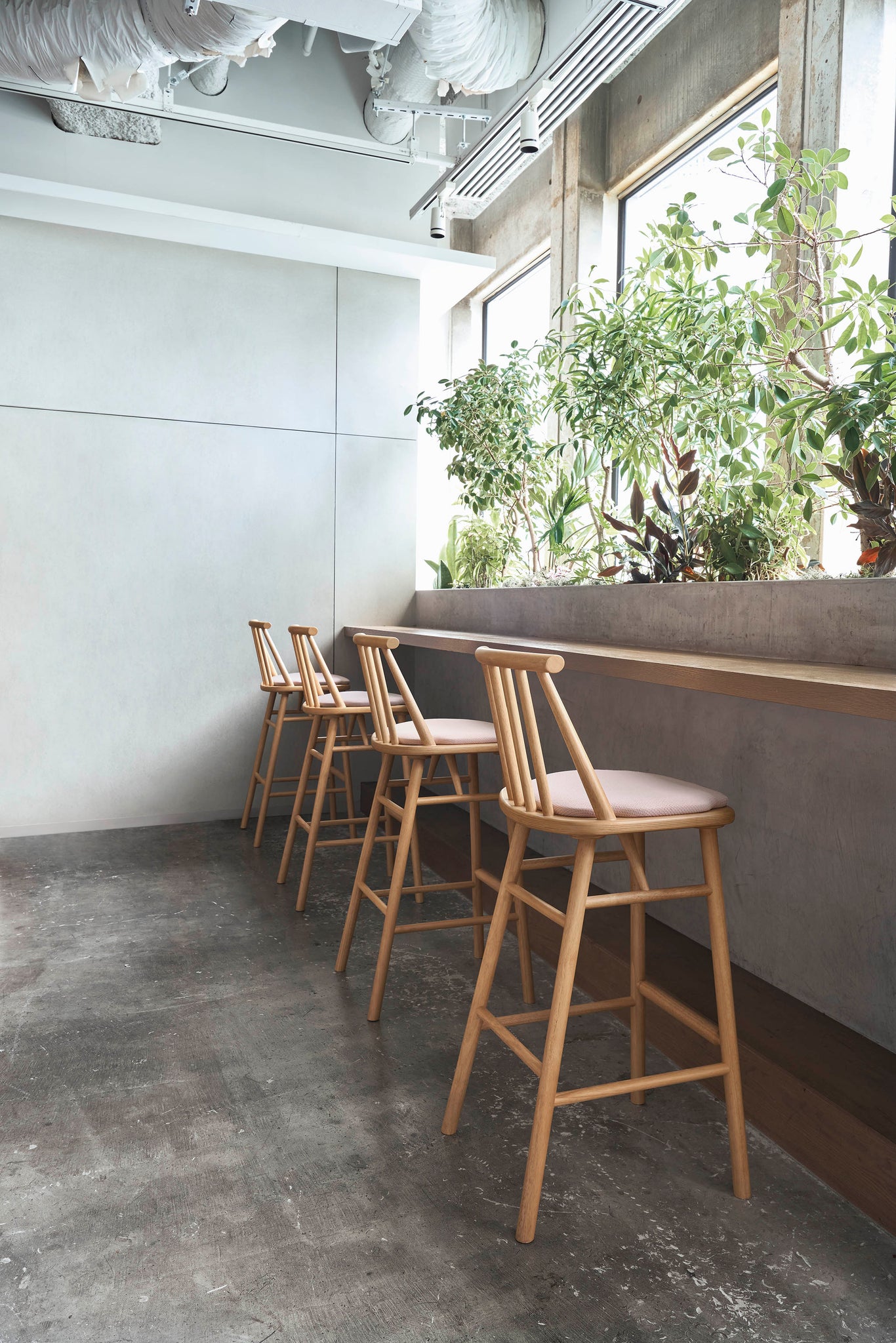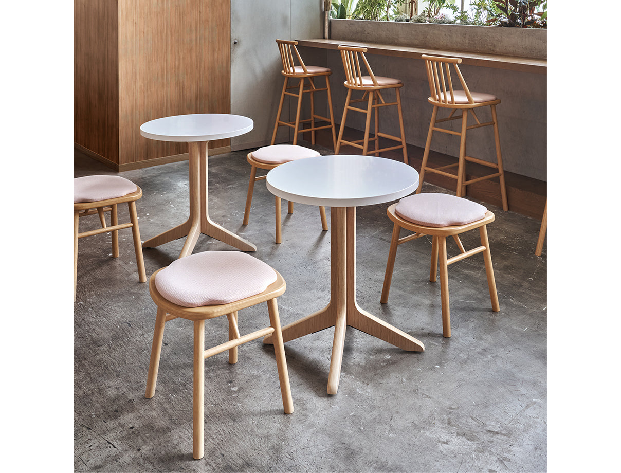 小回りのきくモダンな張座のカウンター用ウィンザーチェア。座面の張地がないプライウッドもあります。