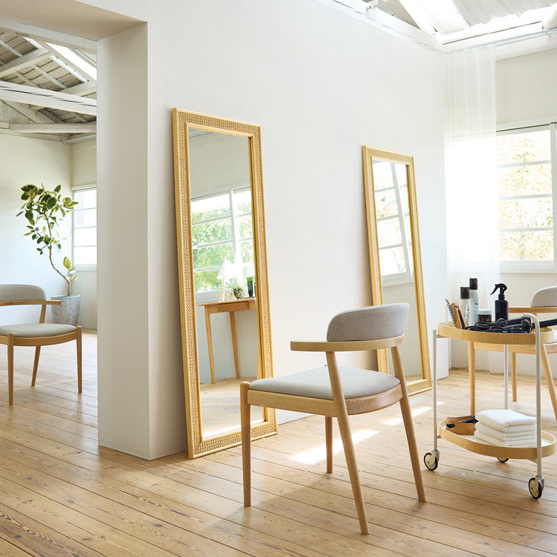 身体を優しく包み込む、曲線美のフレーム設計。離着席を妨げないショートアームがポイントです。