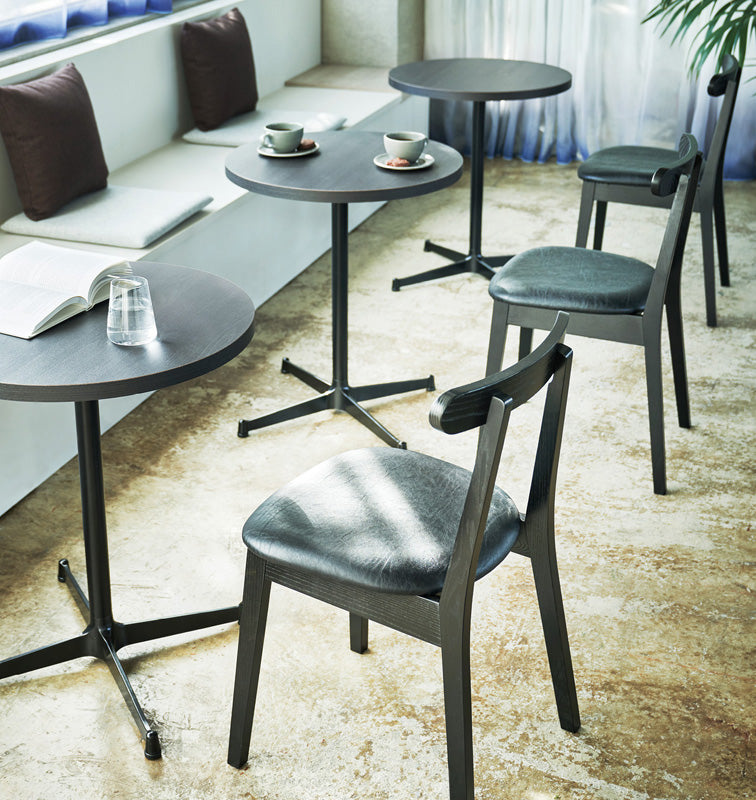 完成度を追求した、ミニマルな設計。エンボスのある木目が、ブラックを引き立てます。アールの優しさと洗練された抜け感が、カフェらしいナチュラルでスタイリッシュな空間をつくります。