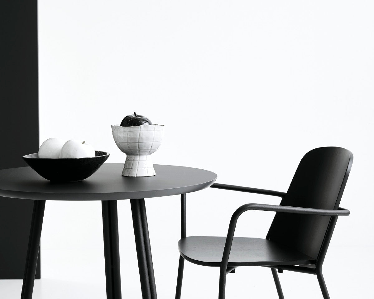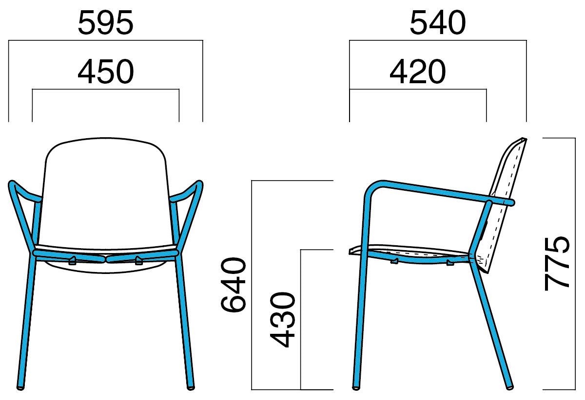 スチール家具らしい硬質で直線的なフレームと、柔らかで曲線的な面が織りなすコントラストが効いたデザイン。